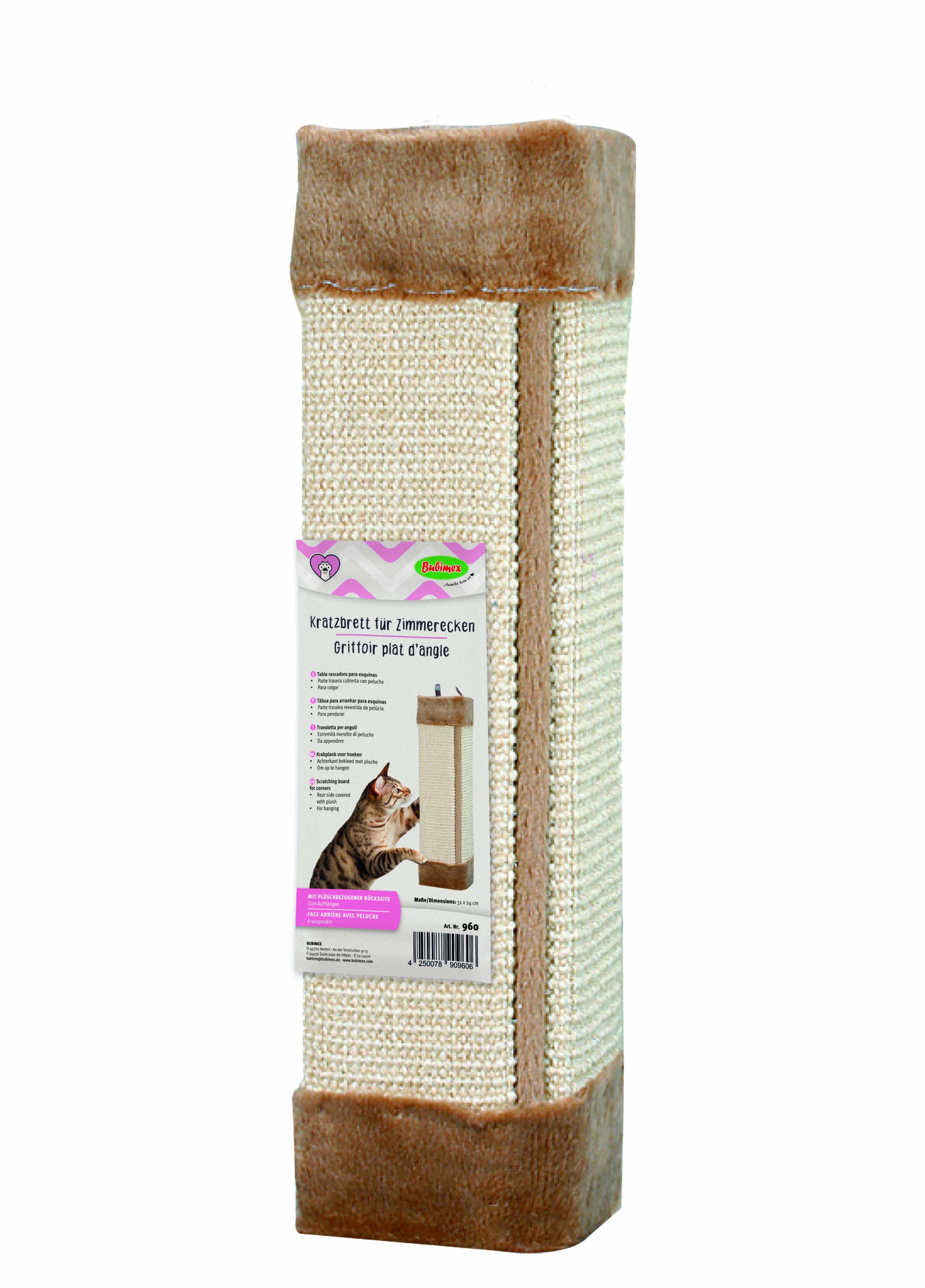 Kratzbrett für Zimmerecken, plüschbezogene Rückseite zum Aufhängen