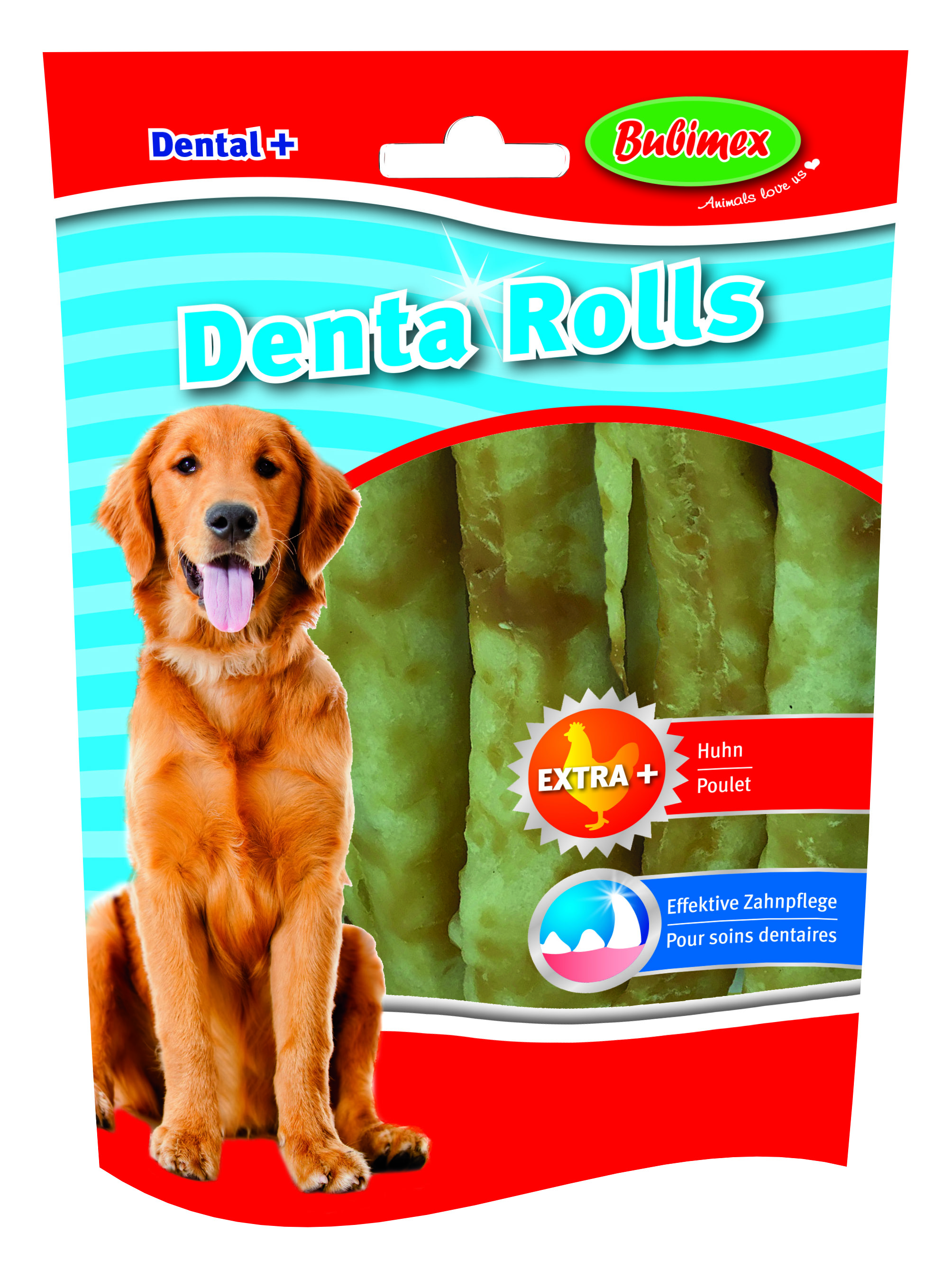 BUBIMEX Denta Rolls mit Hühnerbrust sind Kauspaß, Belohnung und Zahnpflege in einem. Intensives Kauen der bissfesten Rinderhaut fördert die mechanische Reinigung der Zähne. Durch das leckere Hühnerfilet wird die Lust am Kauen noch verstärkt. Zinksulfat, das auch in Zahncremes verwendet wird, wirkt antibakteriell und kann zur Reduzierung von Zahnbelag und Zahnstein beitragen. Die Verdauung kann durch die Fructooligosaccharide unterstützt werden.