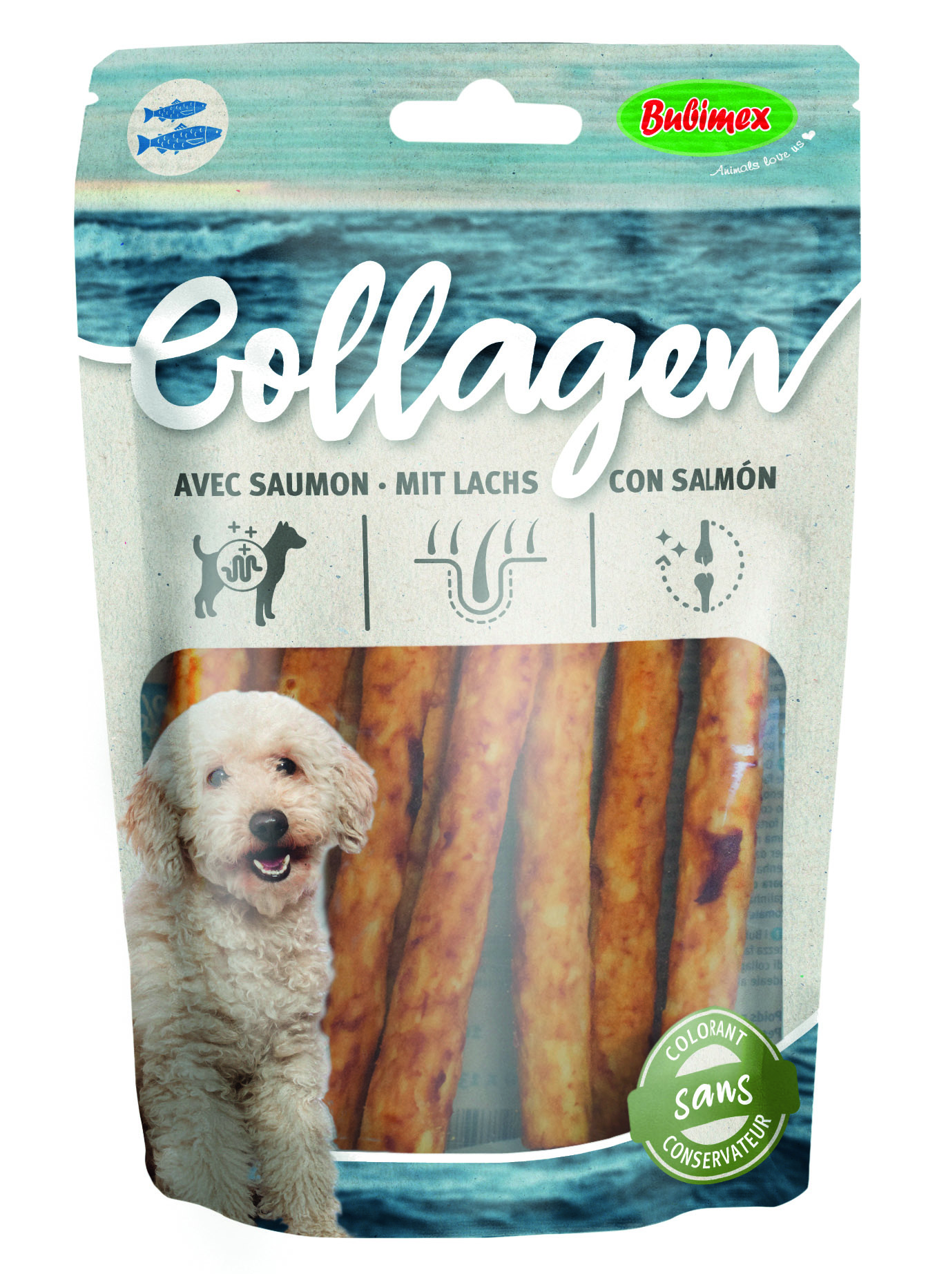 Die Bubimex Kau-Snacks mit Lachs sind leicht verdauliche Leckerlis für Hunde. Dank ihrer Zusammensetzung auf Kollagenbasis ohne Zusatzstoffe sind sie eine ideale Alternative zu Rinderhaut. Kollagen ist ein natürlicher Bestandteil, der Knochen, Knorpel, Haut und Fell unterstützt und die Beweglichkeit Ihres Hundes fördern kann. Fütterungsempfehlung: Als Snack zusätzlich zu den Mahlzeiten. Ein Napf mit frischem Wasser sollte immer bereitstehen.