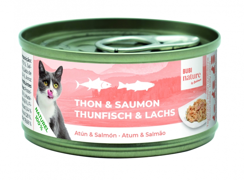 Zusammensetzung: Thunfisch 70 %, Lachs 5 %, Kochbrühe 24 %, Reis 1 %